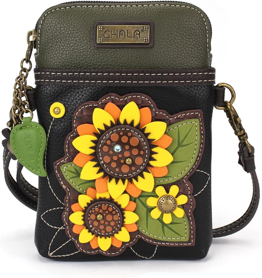 CHALA Plant Life Collection Cell Phone Crossbody Purse-Women PU Leather/Canvas Multicolor Handbag with Adjustable Strap - Sunflower Group - black