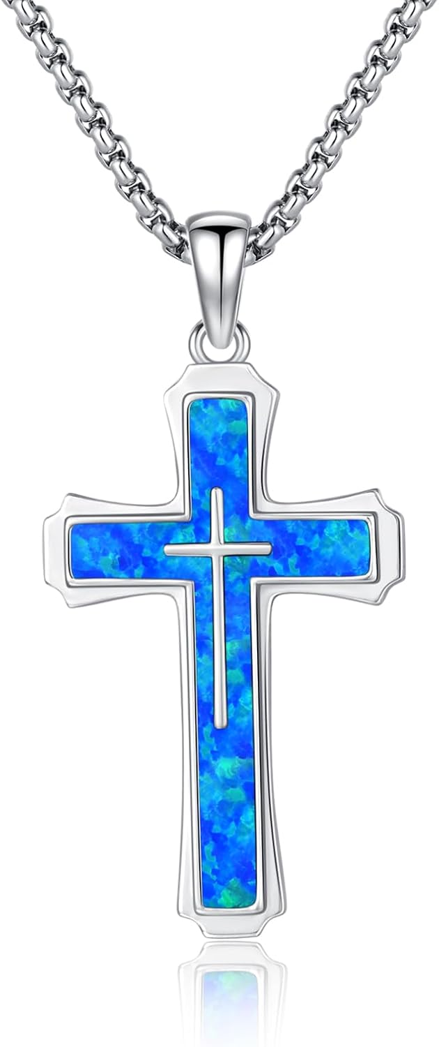 YueYuan Cross Necklace for Men 925 Sterling Silver Abalone Shell/Opal/Malachite/Turquoise/Lapis Lazuli/Obsidian/Tiger Eye Stone/Red Coral/Black Tourmaline/Celtic/Ankh Cross Pendant Religious Jewelry Gift(Blue Opal)