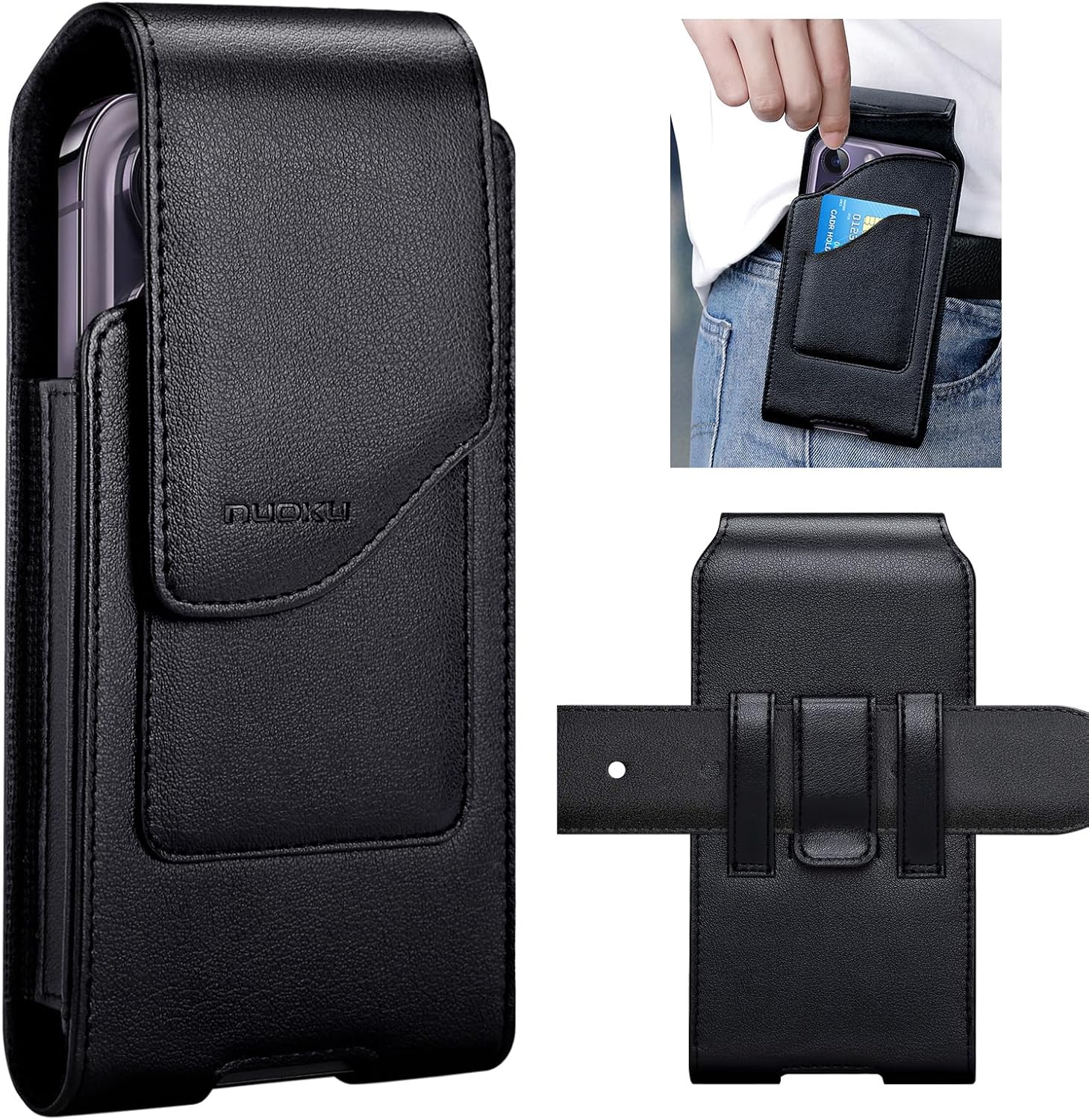 nuoku Phone Holster for Men Belt with Card Holder for iPhone Air 17/16/15/14/13/12/11 Pro Max, Cell Phone Belt Holder for Men Compatible with Samsung Galaxy S25, S24, S23 A54 A53 A52 (Black)