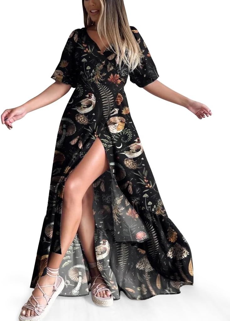 Summer Dresses for Womens V Neck Casual Short Sleeve Sundresses Women's Maxi Beach Dress Vacation Outfits for Woman