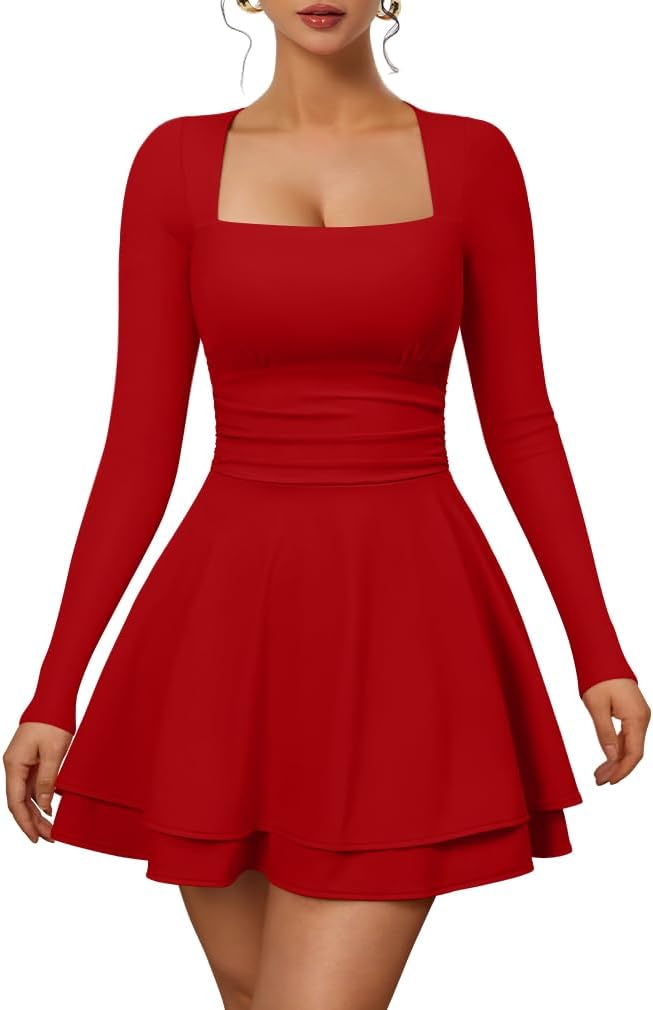 XXTAXN Women’s Sexy Long Sleeve Square Neck Flowy Hem Ruched High Waist Party Mini Dress with Side Pocket