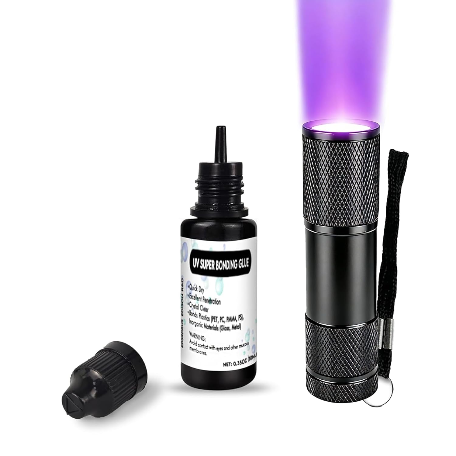 - EDSRDXS UV bonding glue equips with 3W 395nm UV light, which is 0.35oz, 10ml. It is a low-viscosity, high-strength and UV-curable modified acrylate adhesive. This UV glue has a viscosity of 450 to 550 CPS, and is transparent colorless liquid.