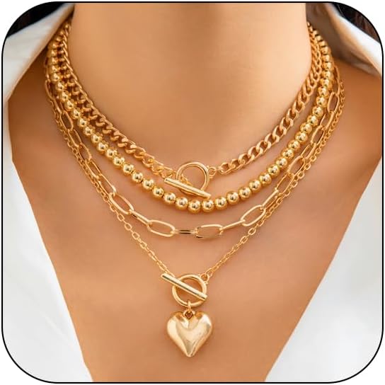 Layered Choker Necklace for Women Heart Pendant Stack Layered Cuban Paperclip Snake Chain Necklaces Trendy Retro Coin Dainty Pendant Gothic Black Necklaces Toggle Clasp Necklace for 4Pcs