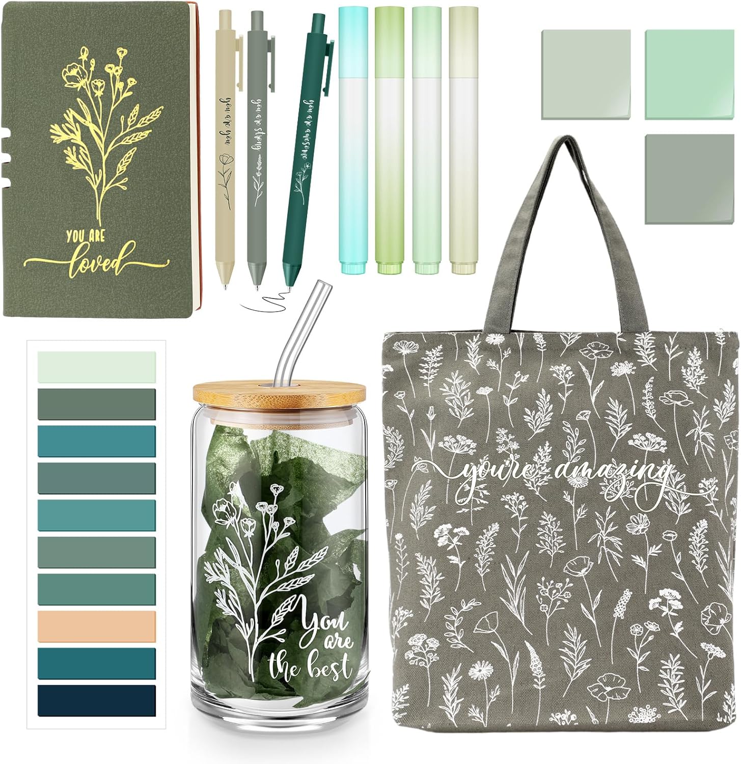 - Comprehensive Gift Set: the inspirational gifts for women set is packaged with love and care, including 1 leather journal notebook, 1 glass cup, 1 canvas tote bag, 3 pads of sticky notes (150 sheets), 1 pad of index tabs (200 sheets), 3 ballpoint pens, 4 highlighters, 1 tissue paper; This thoughtful curation makes it a practical gift for most occasions