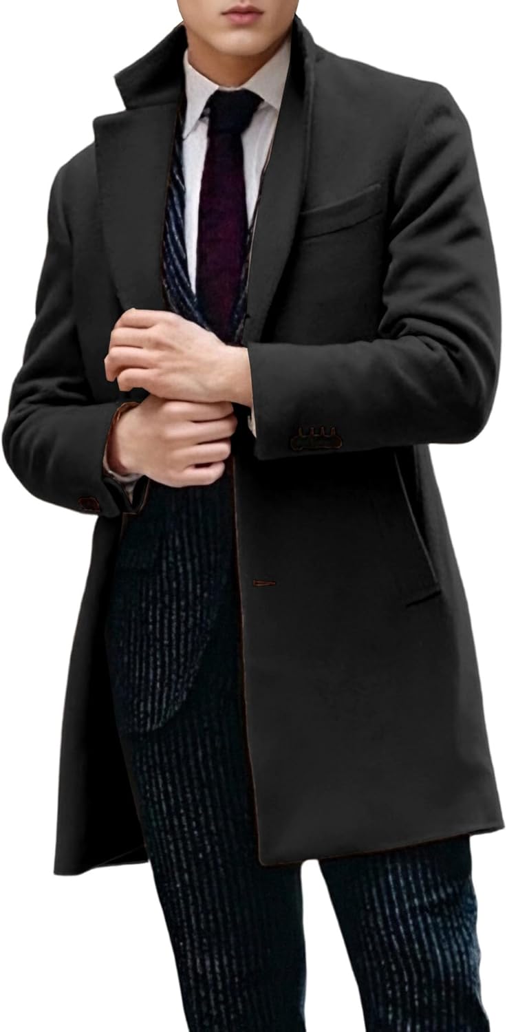 Mens Winter Pea Coat Slim Fit Single Breasted Trench Style Mid Length Casual Business Overcoat