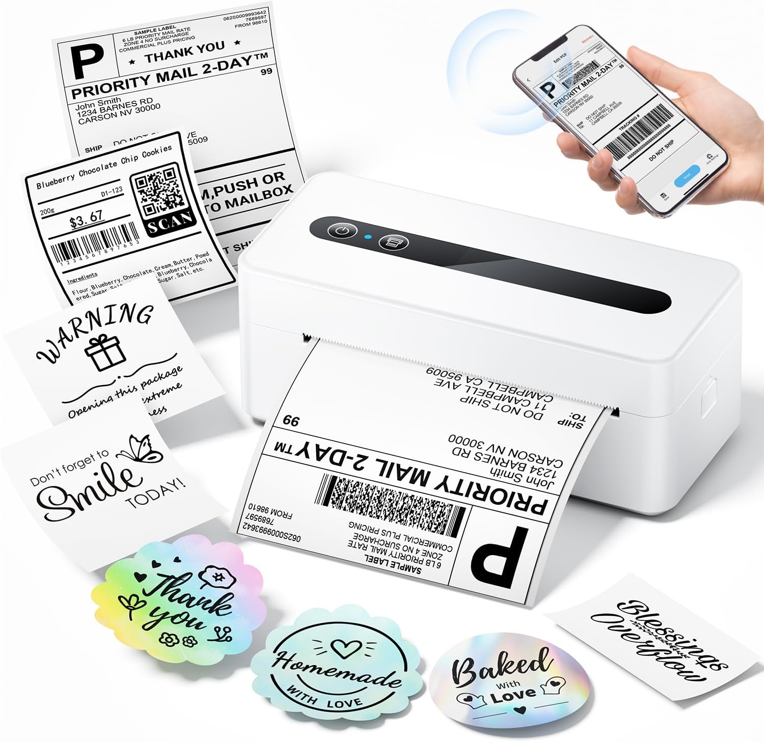 - [Enhanced Performance] The wireless thermal printer integrates advanced technology to refine print head performance, ensuring both print and delivery accuracy. Perfectly supporting not only shipping label printing, but also home organization stickers, branding decoration stickers, and much more(Please note: This thermal printer cannot print in color; it only prints in black and white.)