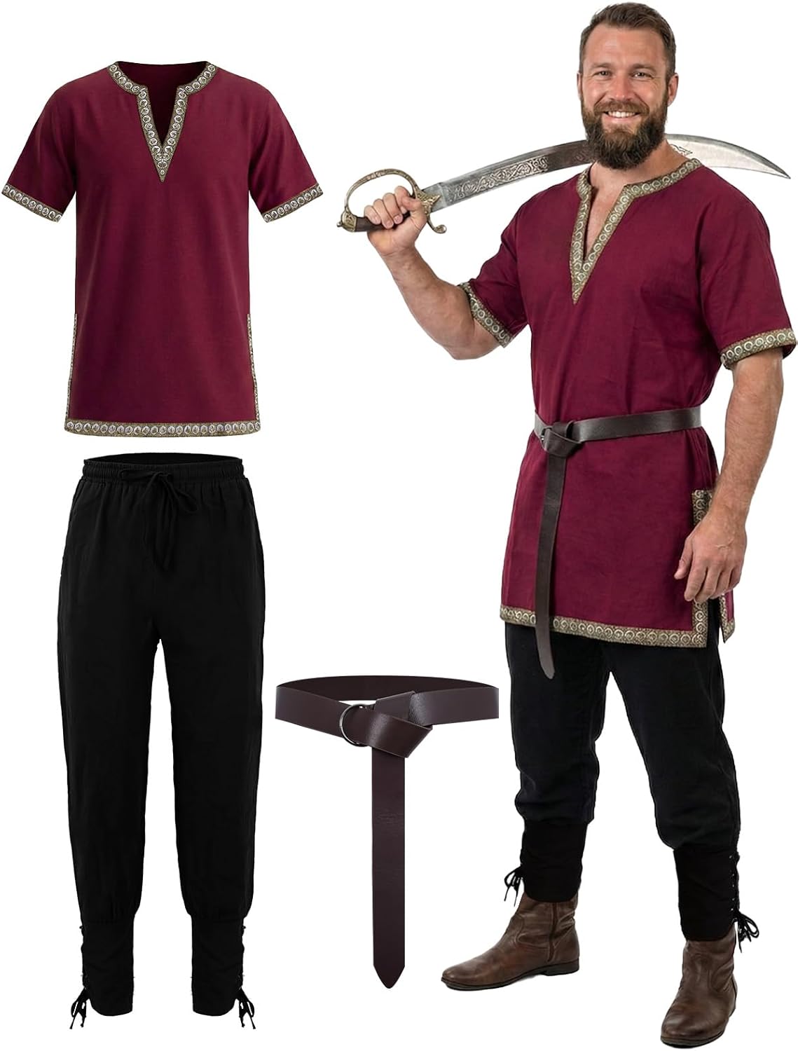 Renaissance Medieval Knight Costume for Men - 3PC Pirate Viking V-neck Tunic Set Halloween Cosplay Outfit
