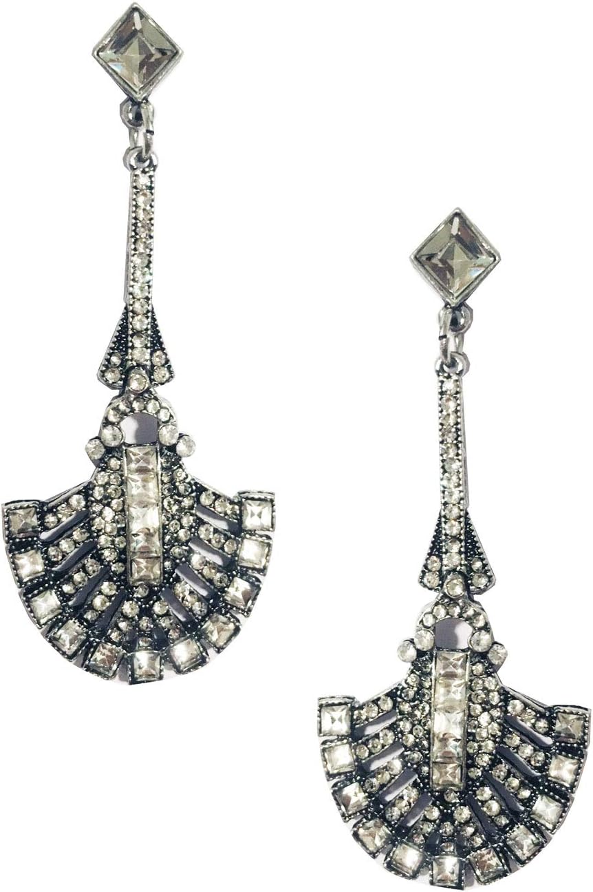 Extra Long Silver Tone Classic Art Deco Antique Vintage Retro Style Silver Tone Gatsby Fan Rhinestone Bridal Prom Wedding Earrings