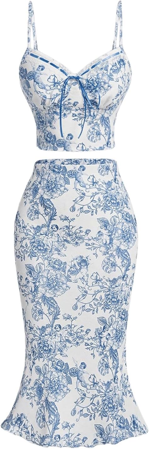 Floerns Women's 2 Piece Outfit Floral Print Tie Front Cami Top with Skirt Set