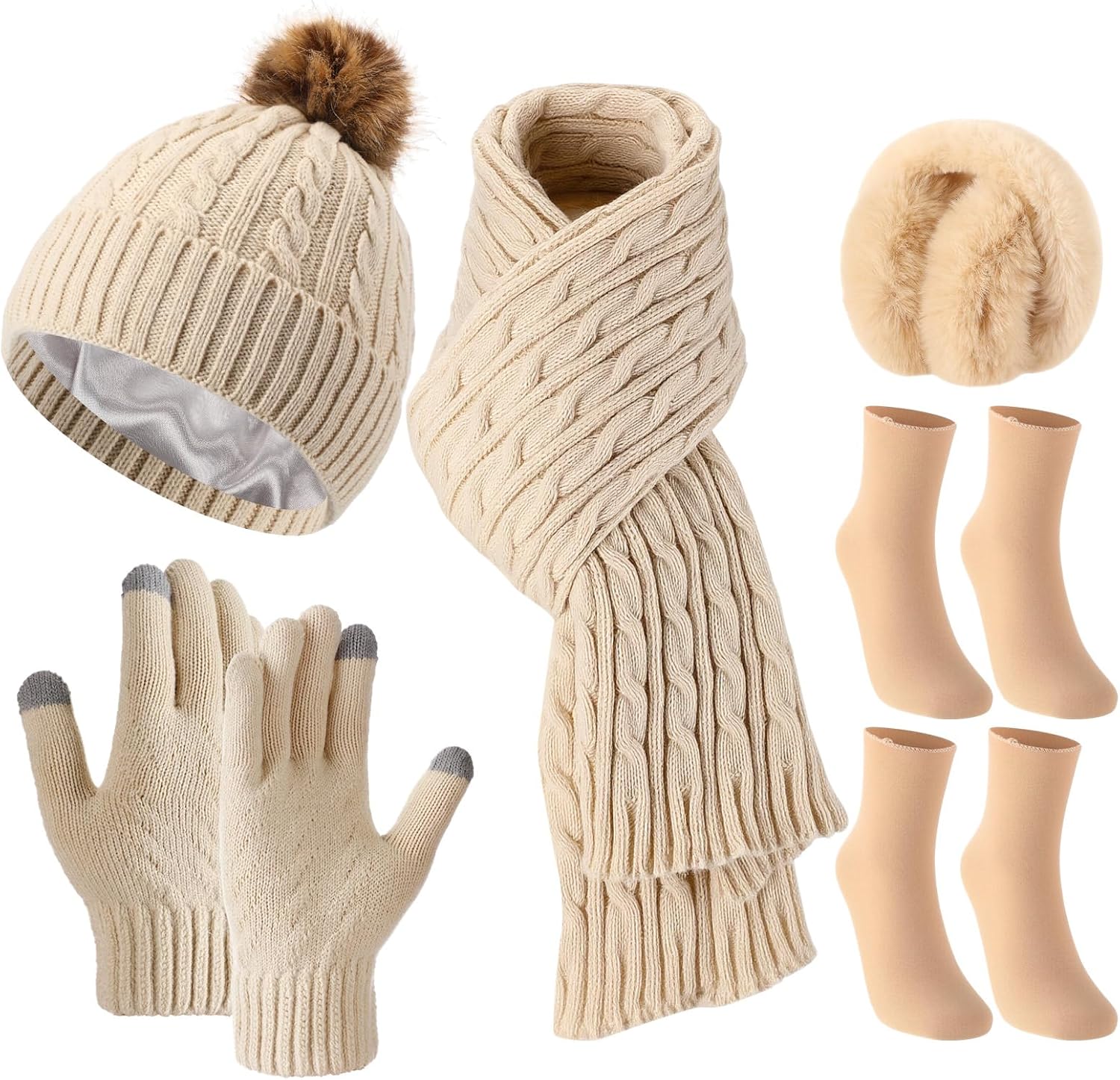 Geyoga 6 Pcs Winter Knit Set with Knit Beanie Hat Long Scarf Touchscreen Gloves Foldable Earmuff Fleece Socks for Women