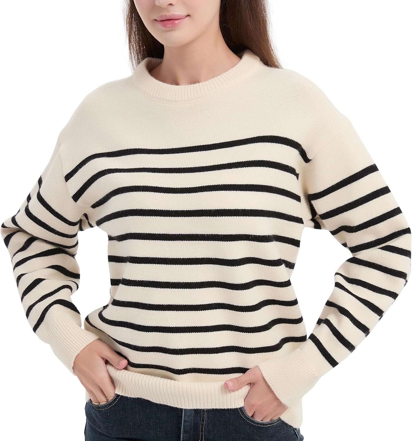 Tronjori Womens Striped Jacquard Crewneck Sweaters Pullover Casual Fall Winter Long Sleeve Knit Tops