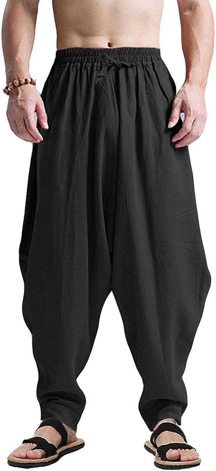CLANMILUMS Men's Cotton Harem Pants Casual Loose Hippie Drop Crotch Trouser