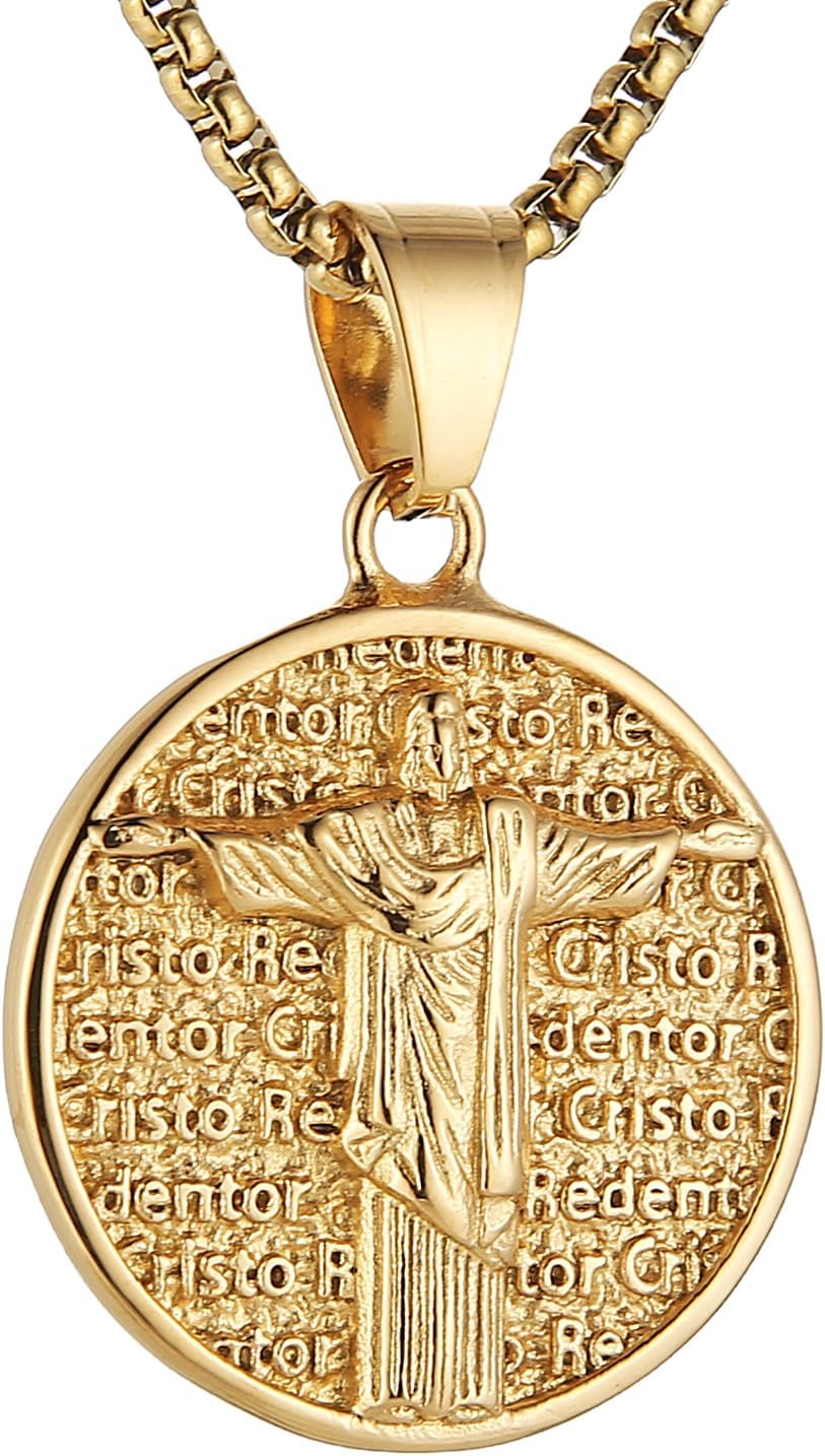 AsAlways Gold Jesus Necklace for Men Stainless Steel Christ the Redeemer Pendant Round Medal Christian Faith Jewelry Gift