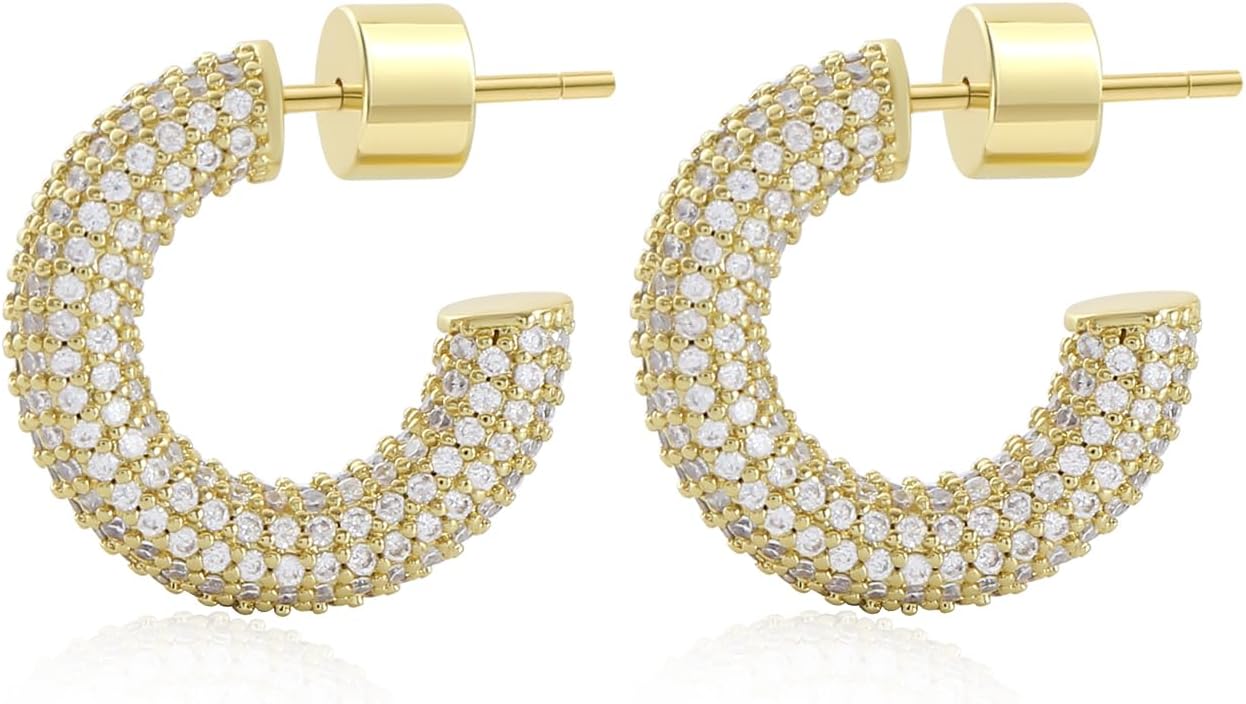 C-Shape Stud Earrings 14K Gold Plated Chunky Open Hoop Earrings for Women Sparkly Cubic Zirconia Dainty Valentines Jewelry Gifts