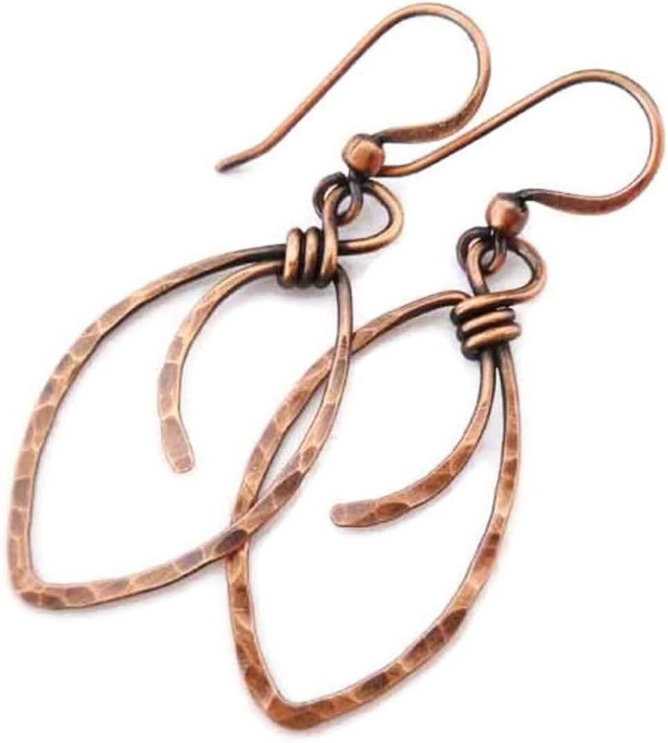 Pillar of Salt Studio Handcrafted Solid Copper Earrings Hammered Marquis Shape Wire Wrapped (Antiqued Copper, 1-3/8" drop)