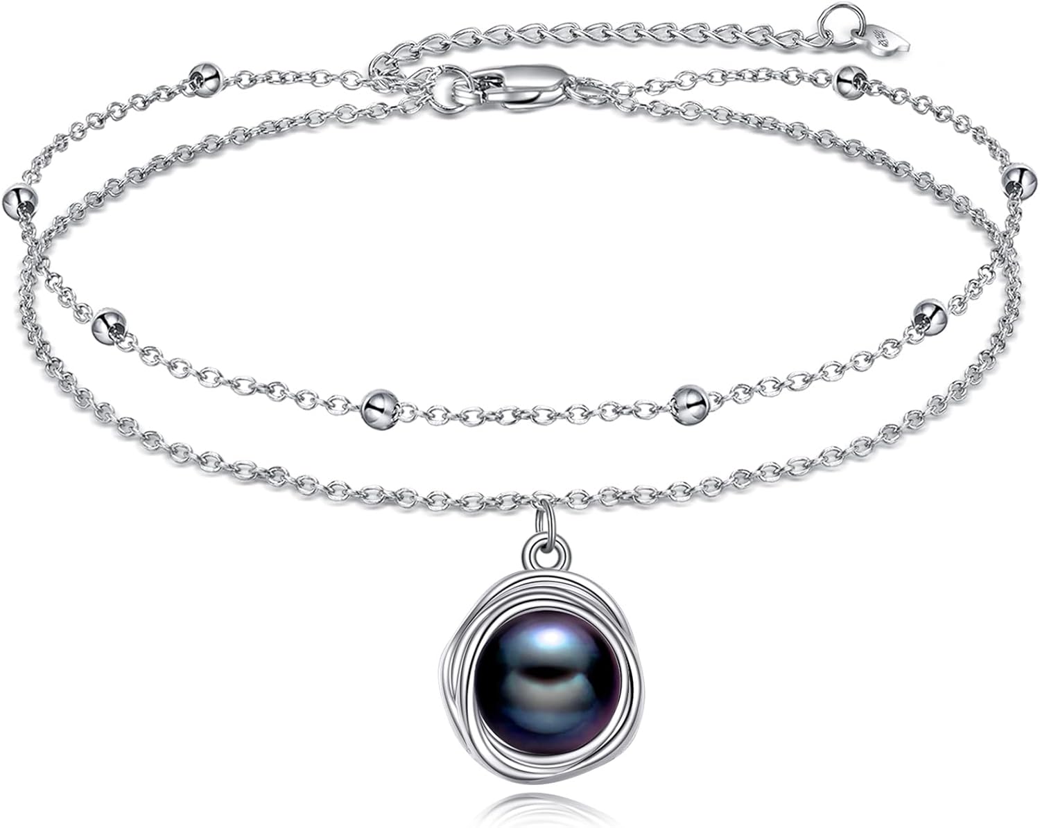 POPLYKE S925 Sterling Silver Pearl Anklet Gemstone Opal/Lapis Lazuli/Larimar/Rose Quartz/Opal Layered Chain Ankle Bracelet for Women Summer Beach Jewelry Gifts