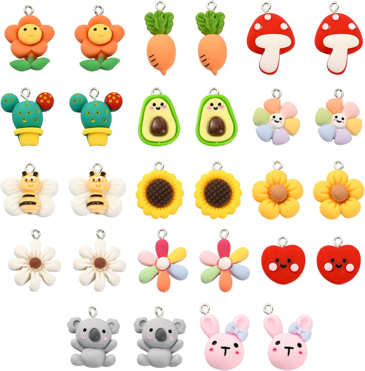BEEFLYING 28Pcs 14 Style Assorted Fruit Animal Flower Resin Charms Cartoon 3D Mushroom Cactus Avocado Koala Hang Decorative Craft Accessories for DIY Earrings Bracelet Jewelry Making