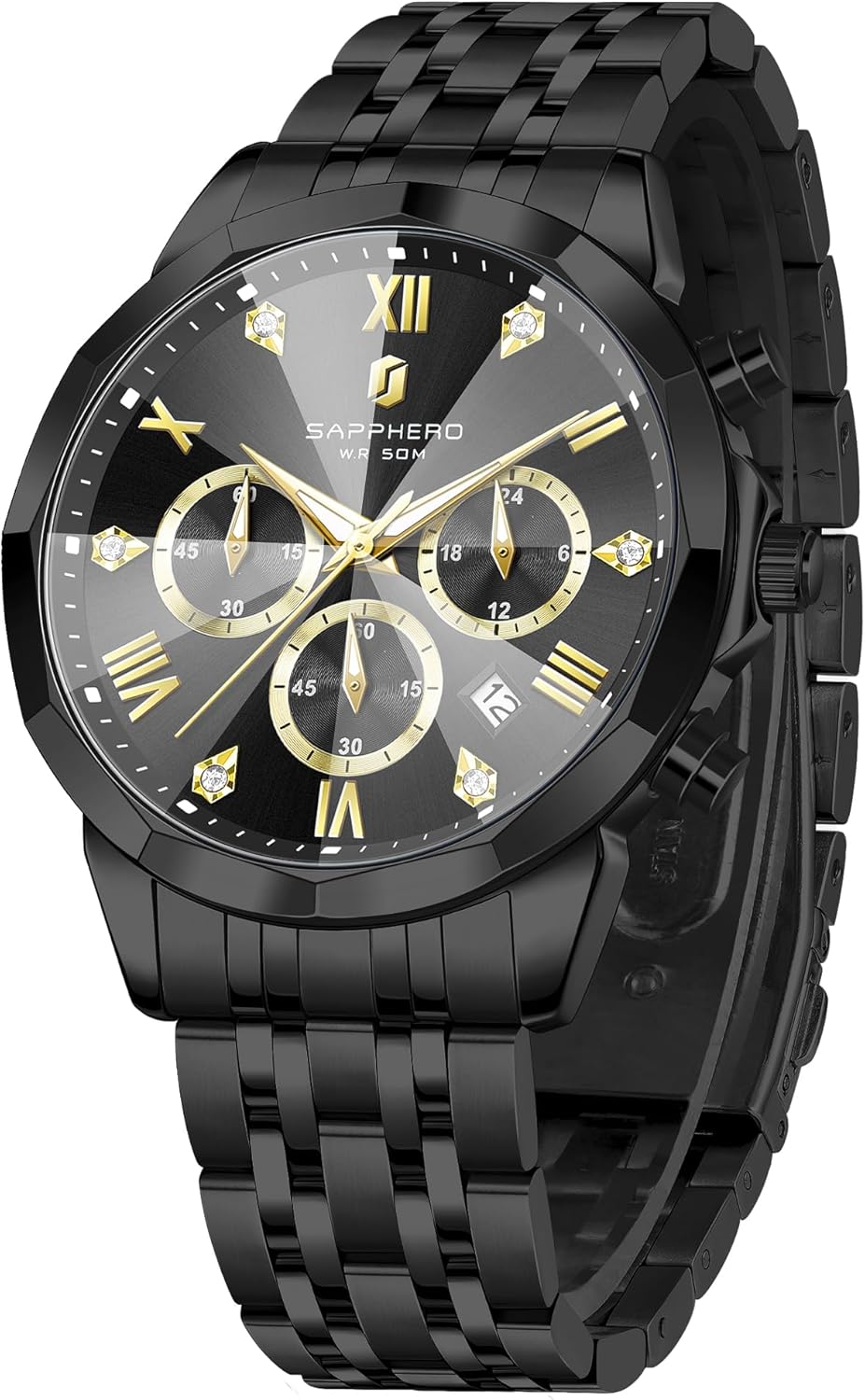 SAPPHERO Mens Watches Analog Quartz Chronograph Stainless Steel Watches for Men 50M Waterproof Men's Wrist Watches with Calendar Luxury Business Work Casual Watch Elegant Gifts for Men