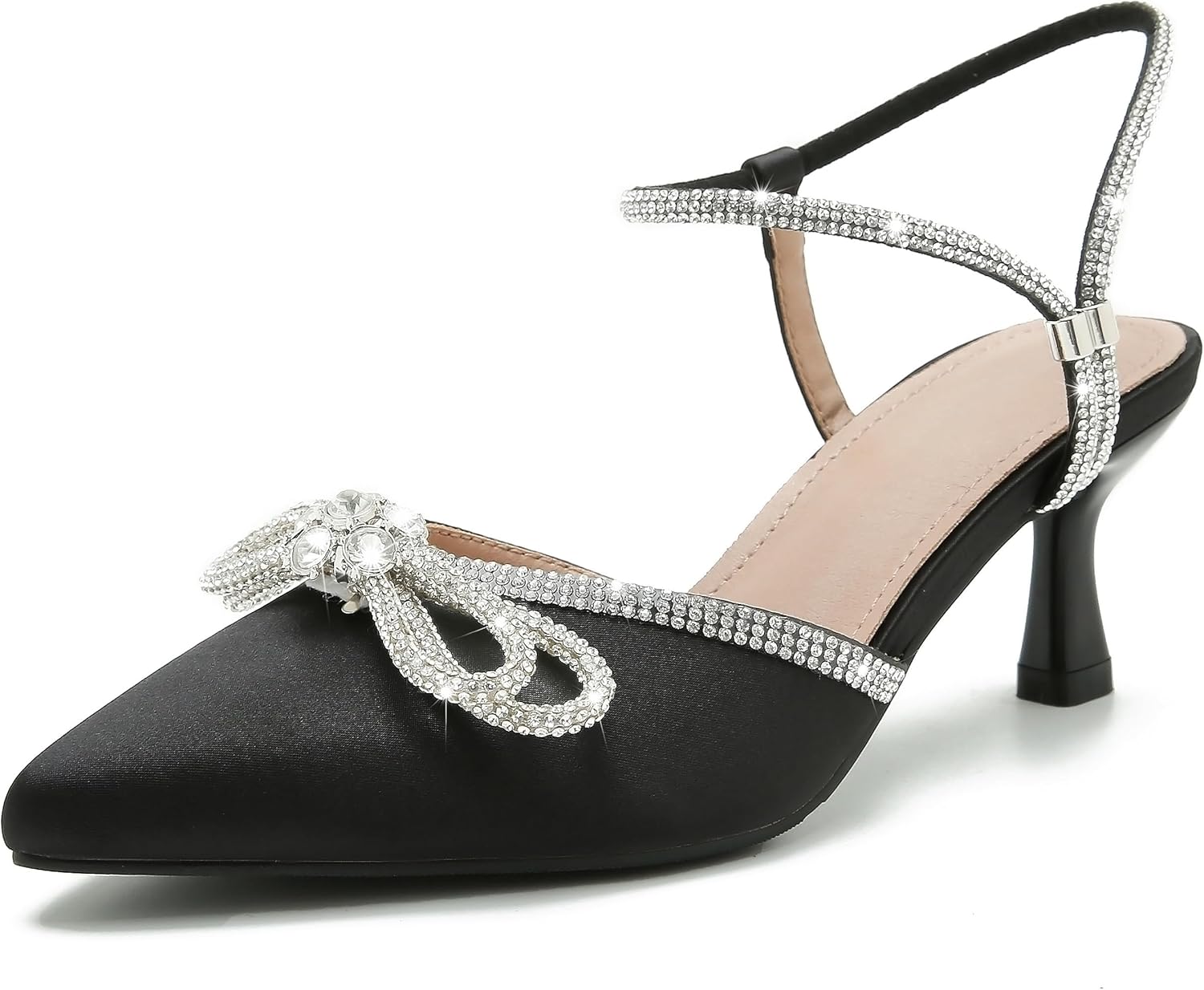Women's Rhinstone Wedding Low Heel Slingback Kitten Heels, Adjustable Strap Pointed Toe Bow Pumps Prom Dress Shoes
