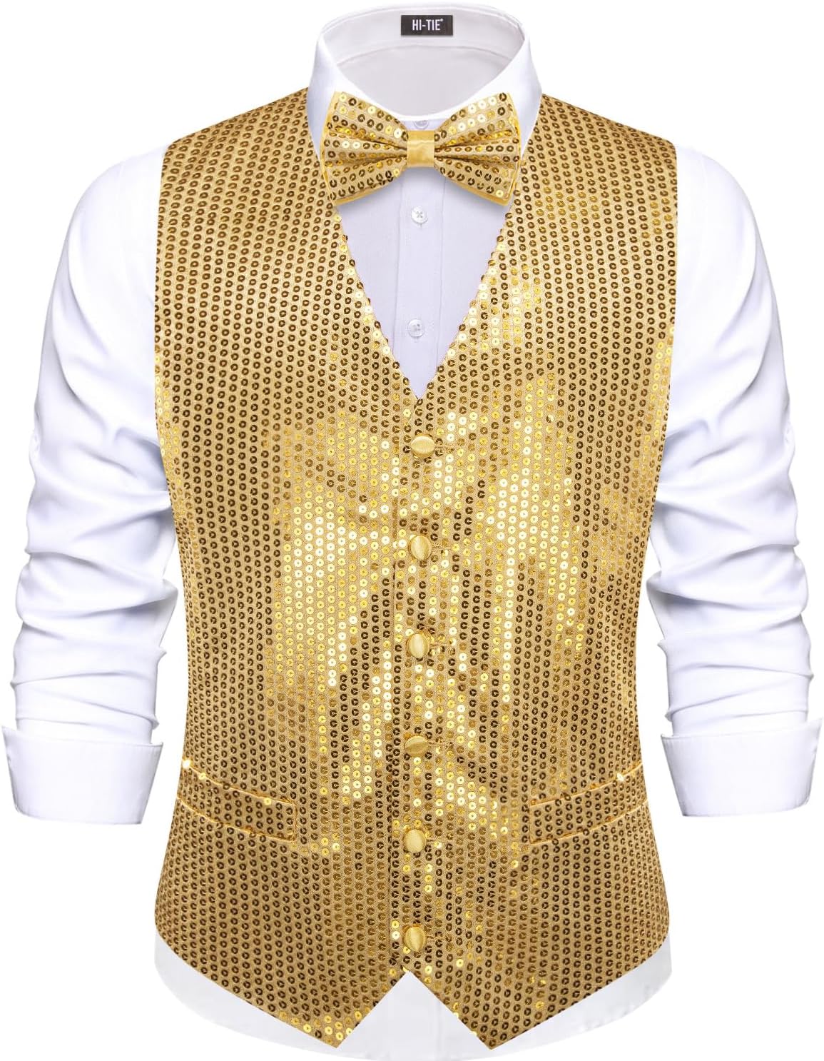 Hi-Tie Men's Sequin Vest Bowtie Prom Suit Vest for Men Tuxedo Dinner V Neck Slim Fit Waistcoats