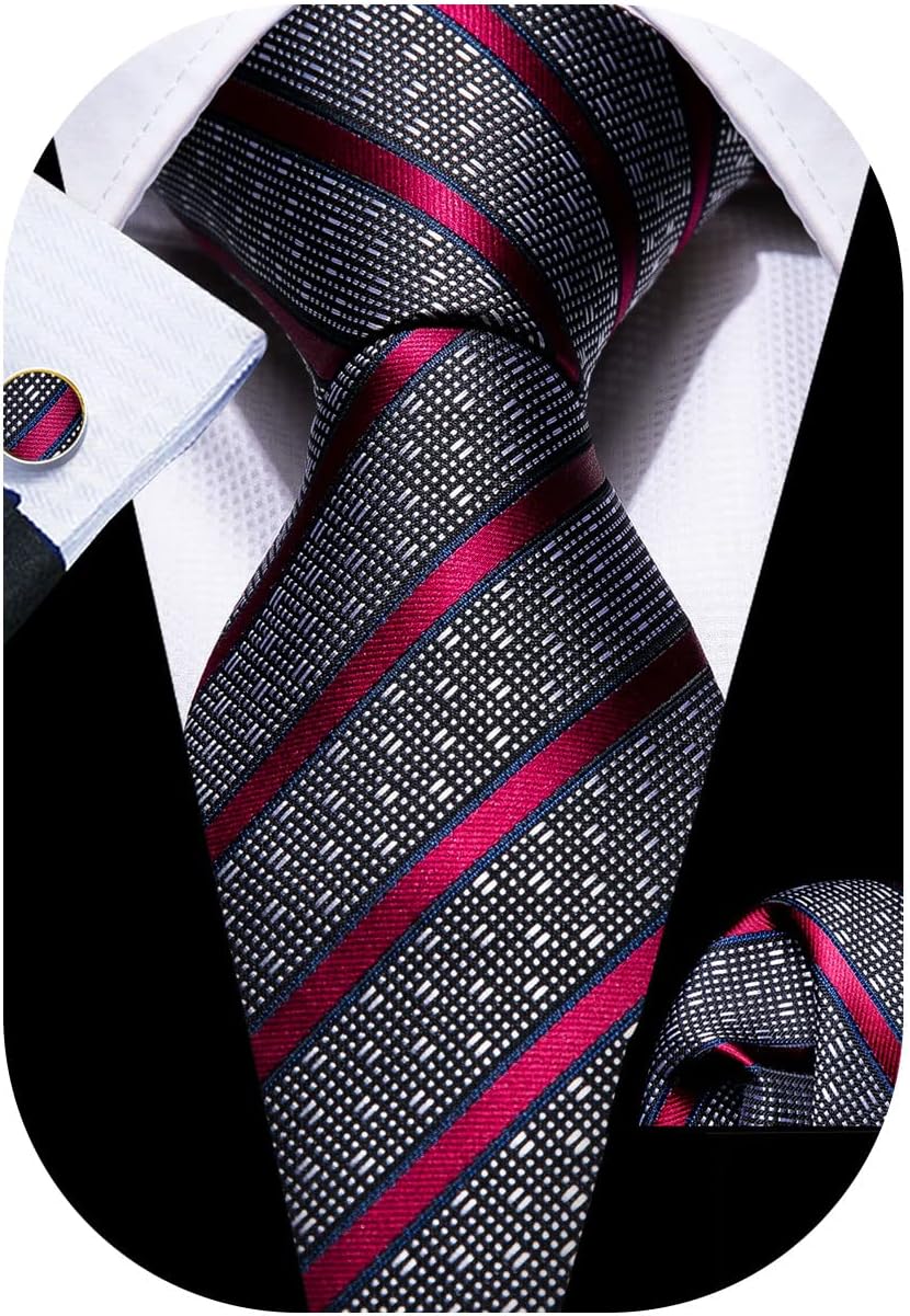 Barry.Wang Tie Sets for Men Silk Stripe Necktie Woven Checkered Handkerchief Cufflinks Formal Business Wedding