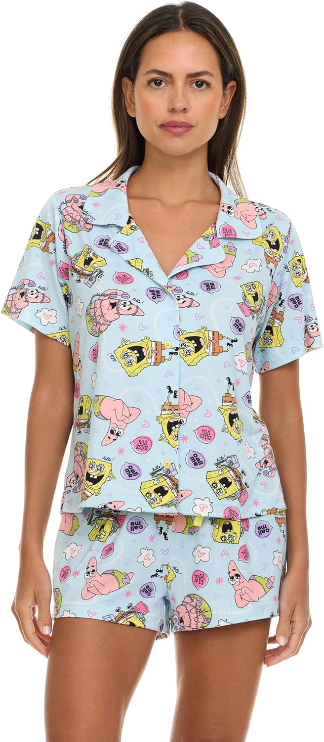 COCO BRANDS Spongebob Womens Pajama Set, Soft Stretchy Pajama Shorts & Short Sleeve, Notch Collar, Button Down Top