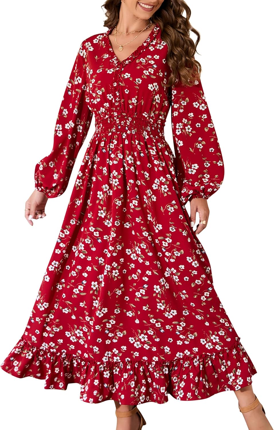 MISSKY Casual V Neck Boho Floral Print Wedding Guest Maxi Dresses for Women Bohemian Flowy Maxi Dress