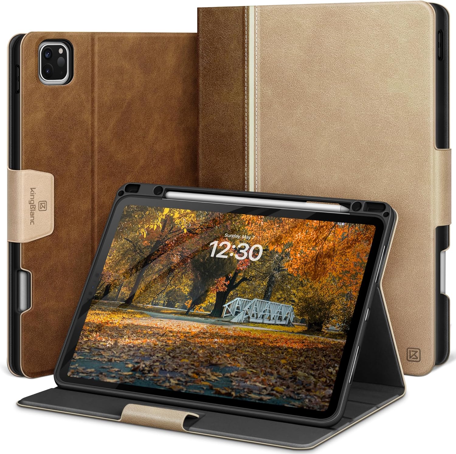 KingBlanc Case for iPad Pro 12.9 6th/5th/4th/3rd Generation 2022/2021/2020/2018 with Pencil Holder, Vegan Leather Bicolor Cover, Auto Sleep/Wake, Support Pencil2 Charging, Multi-Angle Viewing, Beige