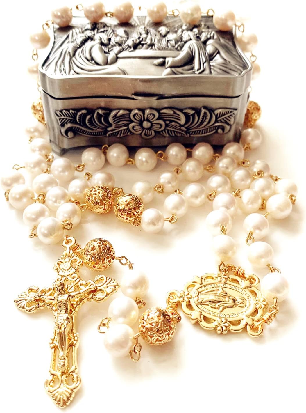 Elegangtmedical handmade White Real Pearl Rose Beads Catholic Rosary Gold Cross Necklace Supper Box