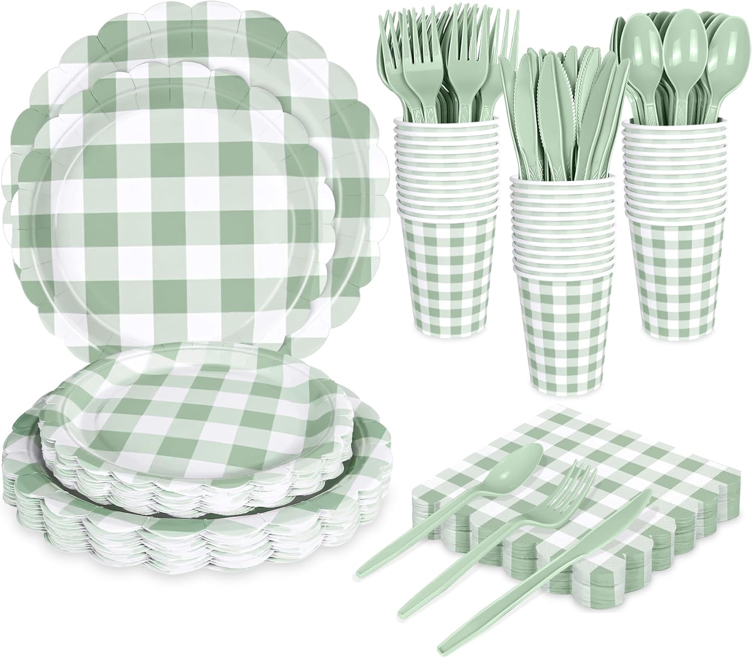 175 PCS Sage Green Gingham Plates and Napkins, Green Checkered Disposable Plates Set with Napkins Cups Plastic Spoons Forks Knives for Dinner Birthday Baby Shower Wedding Supplies Serve 25 Guests