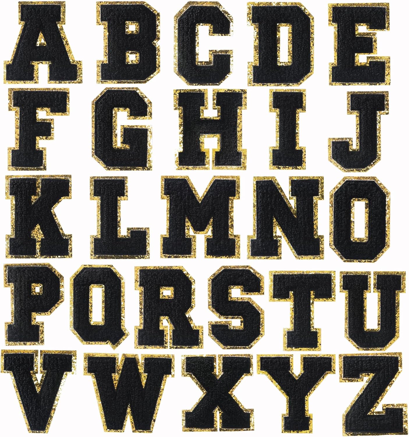 26 Pieces Black Chenille Letter Patches, Embroidered Letters, Glitter Patches, Varsity Iron on Gold Letter Patches, Adhesive Sticker Letter Patch 3.1in Height
