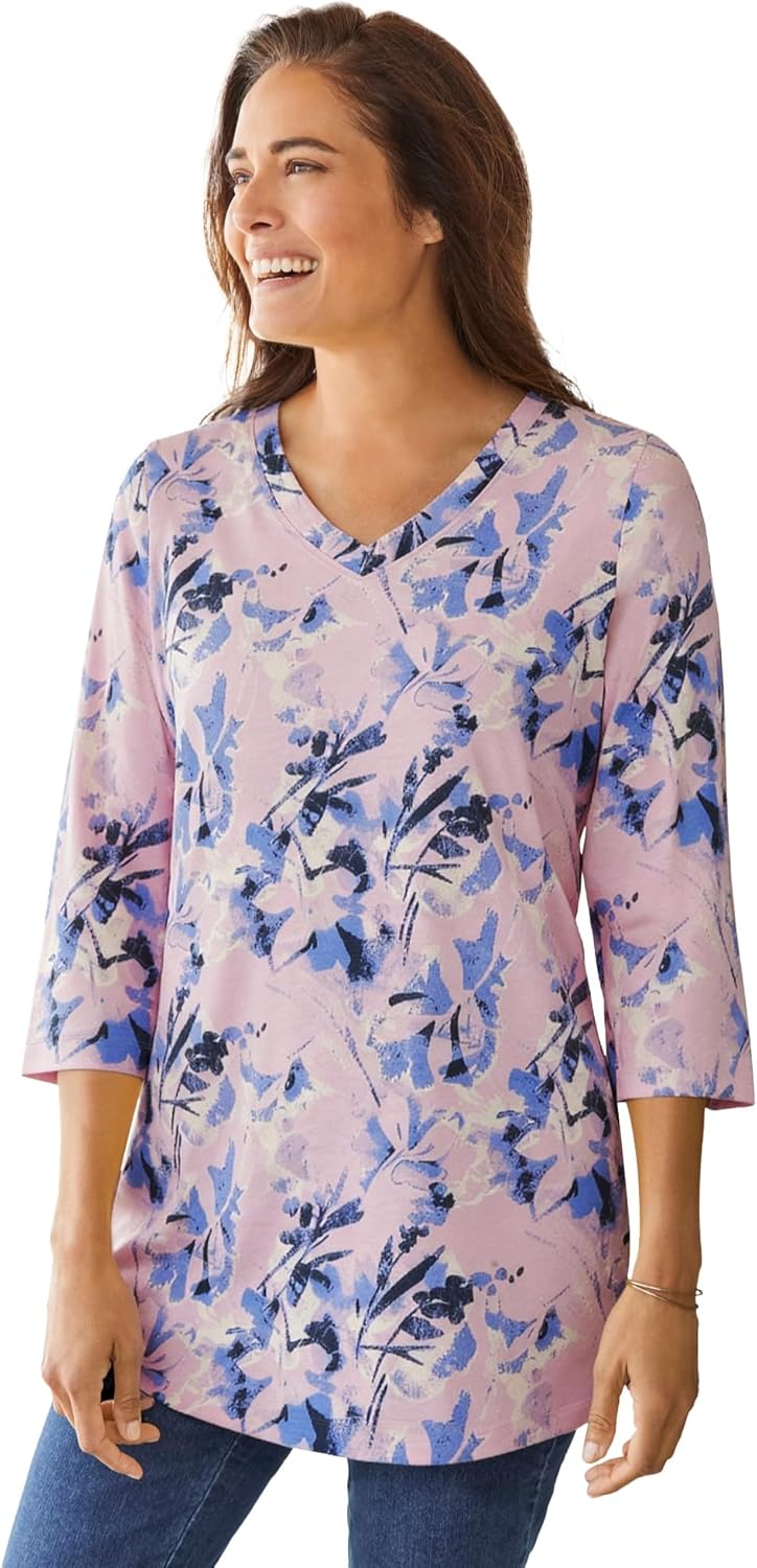 Woman Within Plus Size Perfect Printed Three-Quarter Sleeve V-Neck Tee