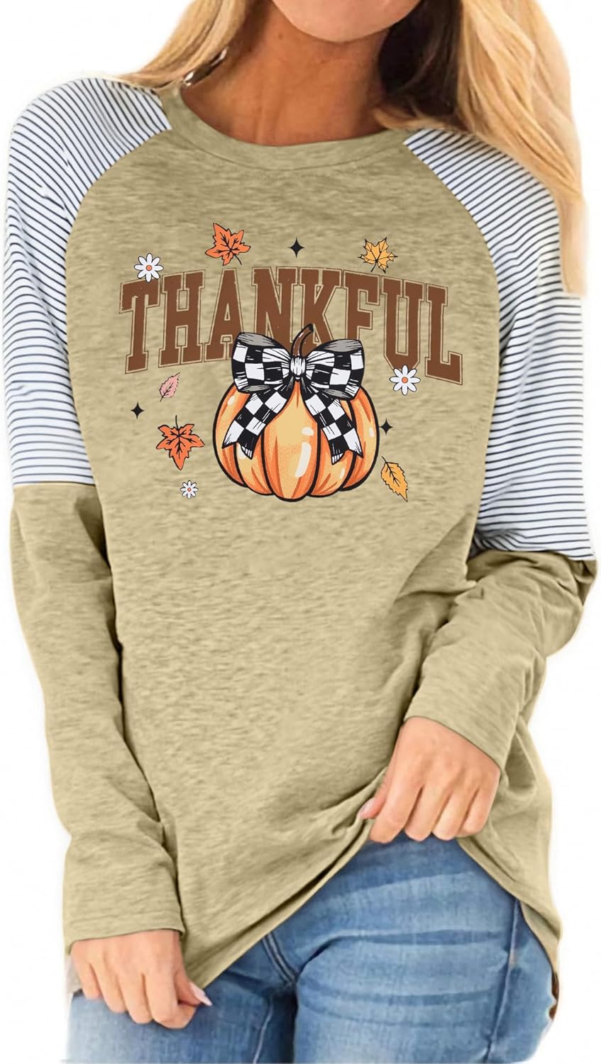 Thanksgiving Shirts for Women: Thanksgiving Pumpkin Tshirt Thankful Fall Raglan Long Sleeve Tops