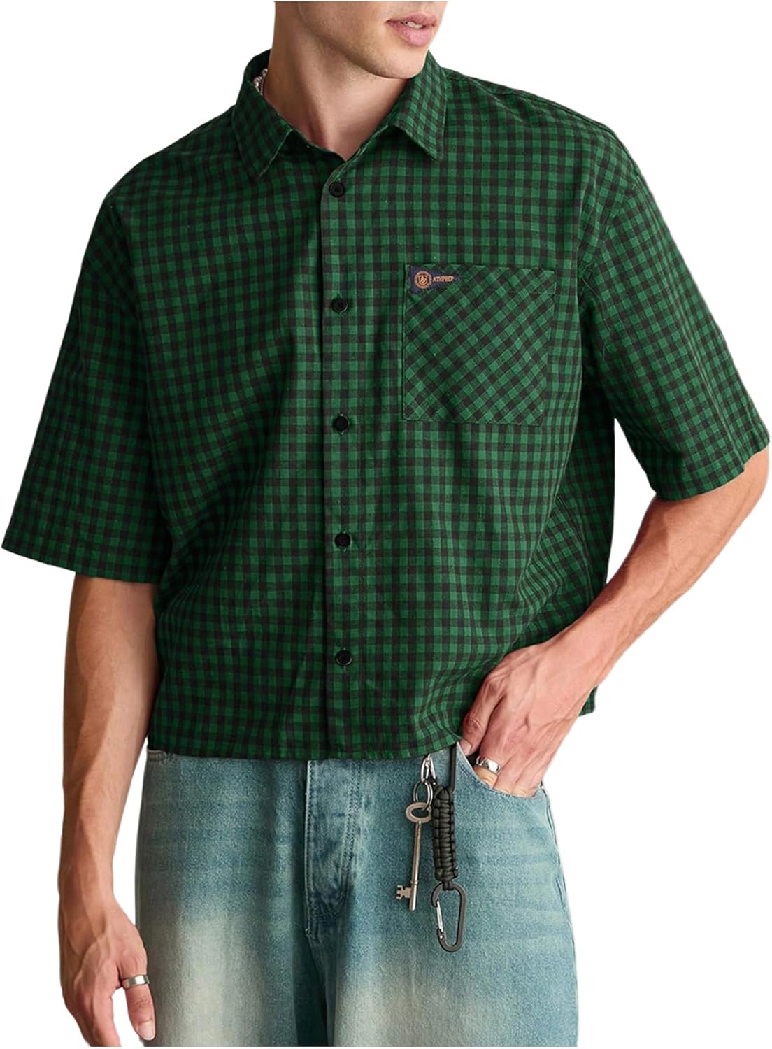 SHENHE Men's Plaid Button Down Short Sleeve Shirt Loose Fit Casual Shirt with Chest Pocket