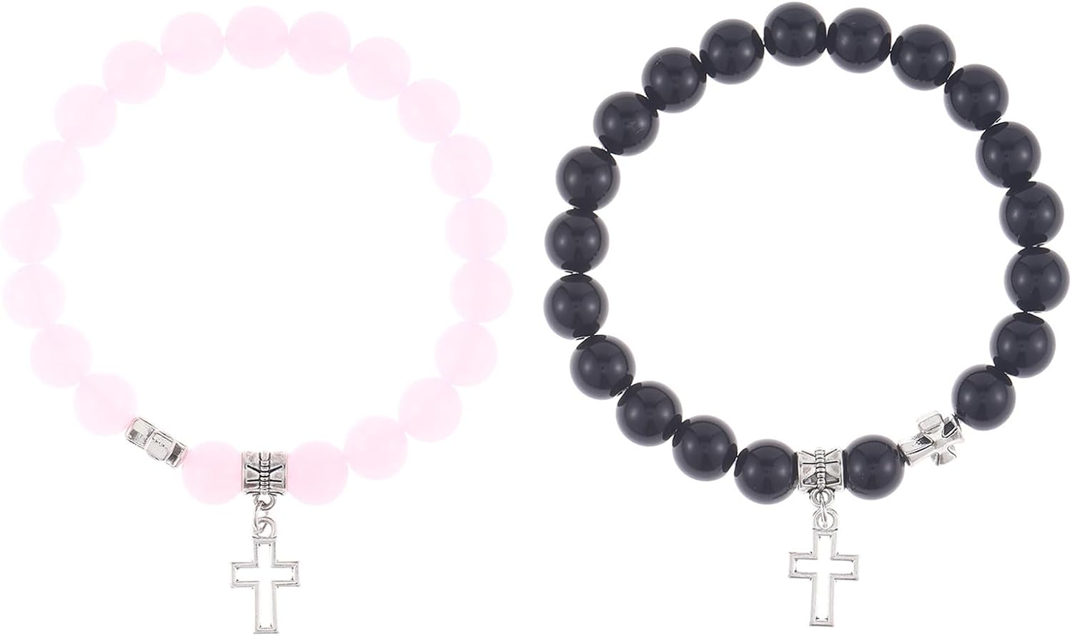 coadipress 2 PCS Natural Healing Stone Cross Bracelet for Women Fashion Christian Cross Beaded Elastic Bracelet Religious Inspirational Charm Jewelry