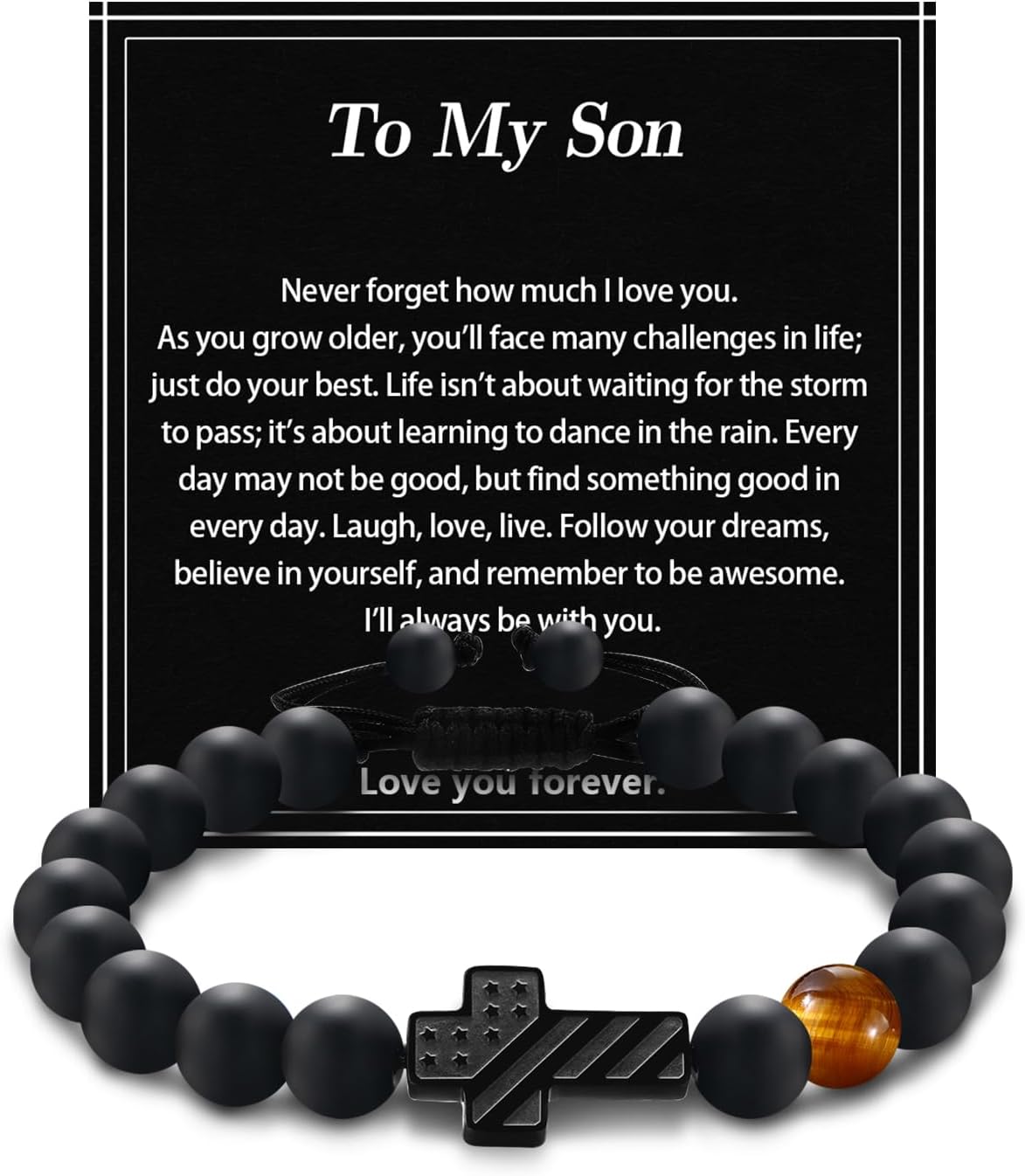 Men's Cross Bracelet Gifts for Teen Boys American Flag Cross Beads Bracelet Inspirational Christian Religious Christmas Valentine Gifts Jewelry Gifts for Boys Kids Teens Men Grandson Son