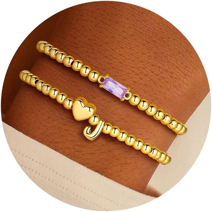 Turandoss Birthstone Beaded Bracelets for Women – Dainty 14K Gold Plated Heart Initial A-Z Charm Birthstone Bracelets, Stackable Waterproof Strand Bead Ball Bracelet Jewelry Birthday Christmas Gifts