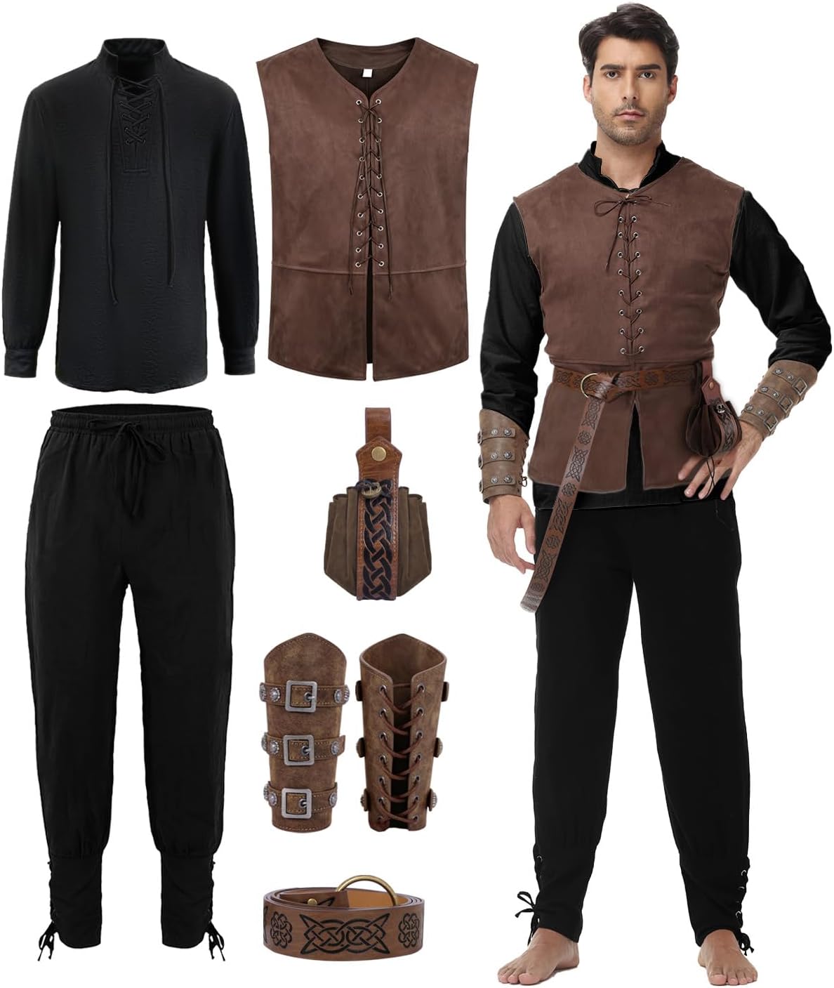 Renaissance Medieval Costume for Men - Pirate Viking Costume 7 Pcs Set, Medieval Cosplay Halloween Outfit