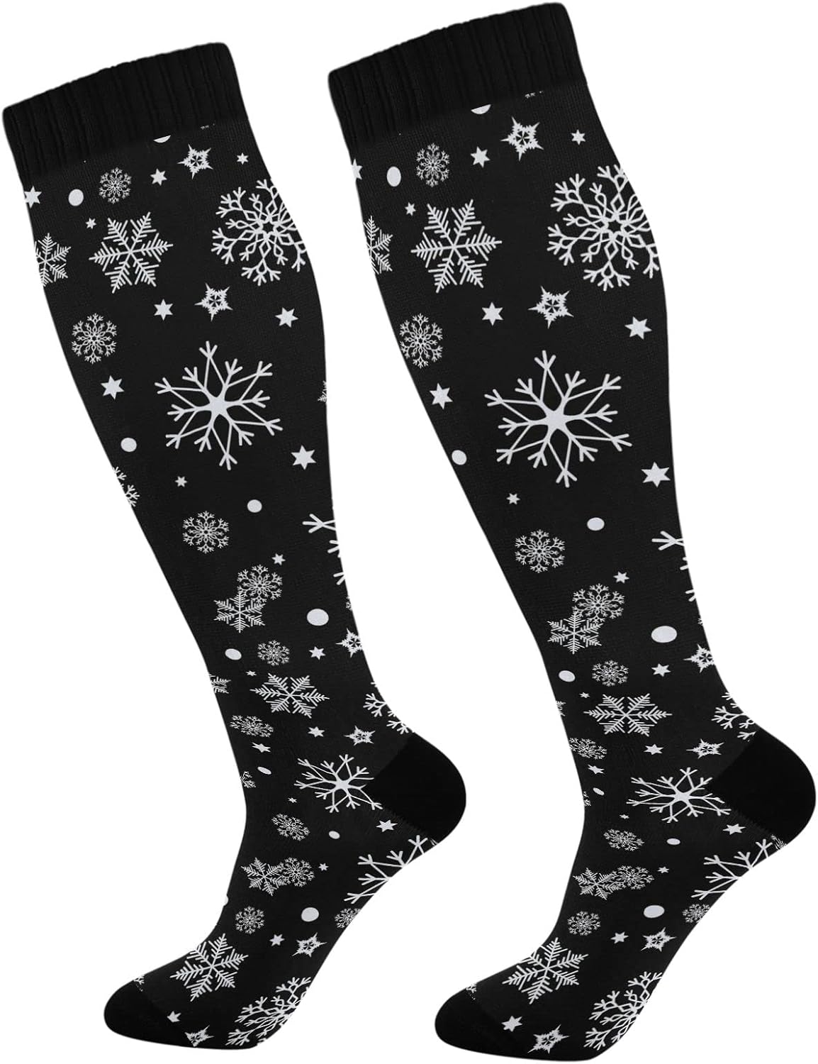 Kigai Knee High Socks Christmas Black Snowflake Compression Sock 1 Pair Casual Athletic Tube Socks for Soccer Women Men Medical Nurse Warm Stockings, 20-30mmHg