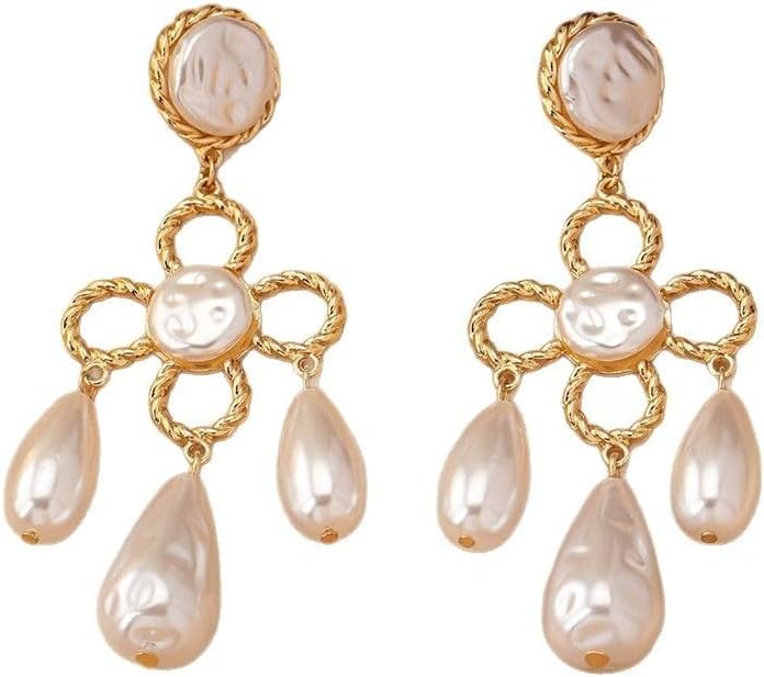 Statement Baroque Pearl Chandelier Earrings for Women Gold Tone Round Teardrop Faux Pearls, Vintage Dangle Drop Design For Women Party Jewelry