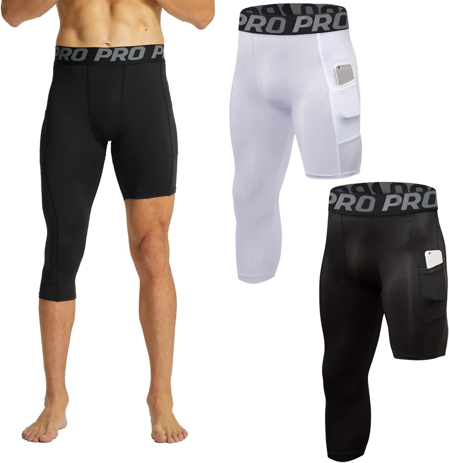 Men's One Leg Compression Pants 3/4 Capri Single Running Tights Basketball Leggings Athletic Sports Base Layer 2 Pack