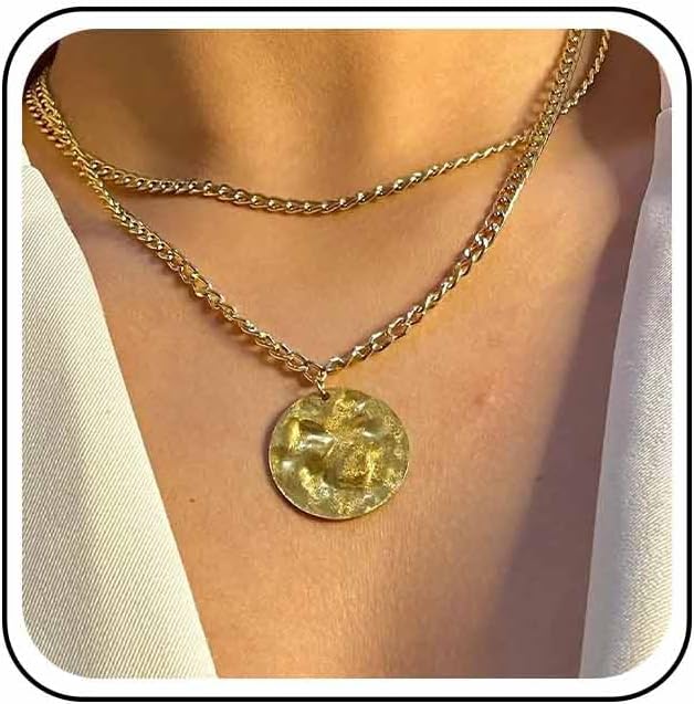 Andelaisi Boho Layered Disc Coin Choker Necklace Hammered Coin Pendant Necklace Large Coin Collar Necklace Choker Vintage Metal Coin Necklace Chain for Women