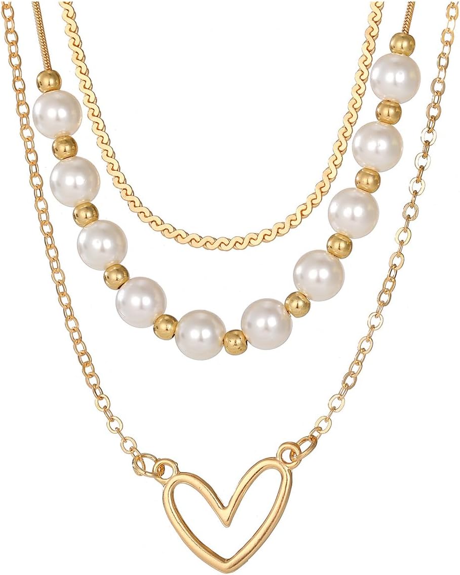 Layered Pearl Bead Necklace for Women,Exquisite Adjustable Hollow Love Heart Statement Pendant Choker,Personalized Fashion Jewelry Accessories Gift