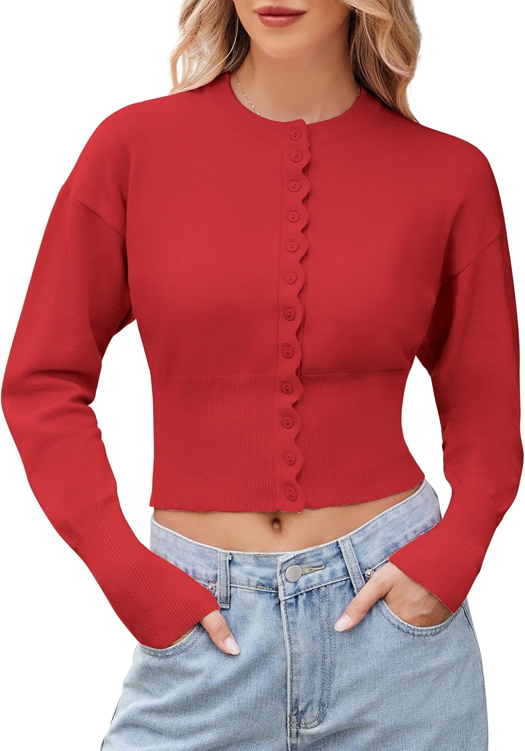 Womens Cropped Cardigan Sweaters Button up Fitted Long Sleeve Crew Neck Ribbed Knit Crop Top