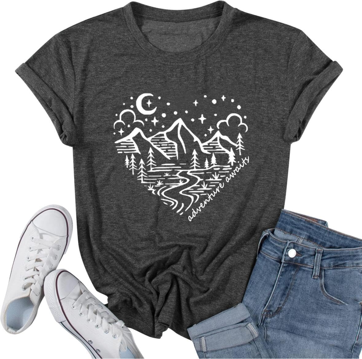 Women Mountain Shirts and So The Adventure Begins Tshirt Sunshine Moon Nature Pine Graphic Tees Heart Let's Go Find It Top