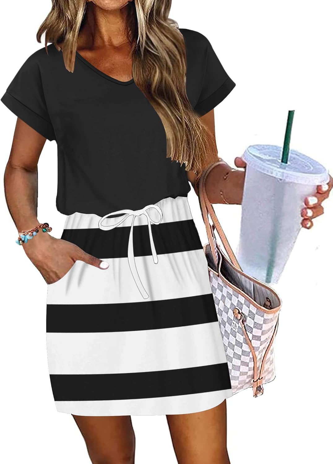 AUSELILY Women's Summer Dress 2026 Short Sleeve Tshirt Drawstring Waist Beach Cover up Casual Mini Short Dresses with Pockets