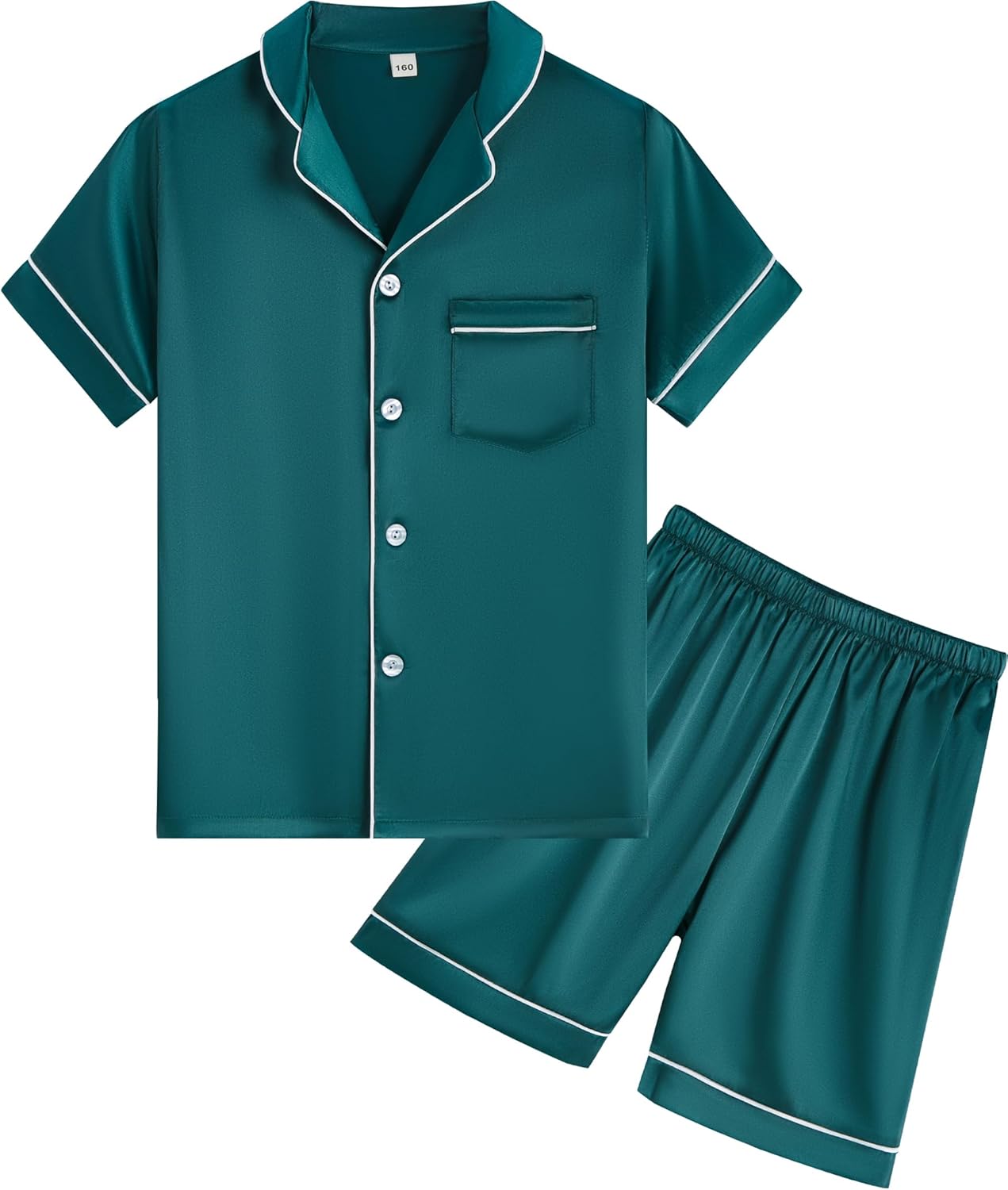 Pajama Set for Kid Boy Girl Button-up Silk Pajama Sleepwear Nightwear Loungewear Set Gifts Short Sleeve Loungewear