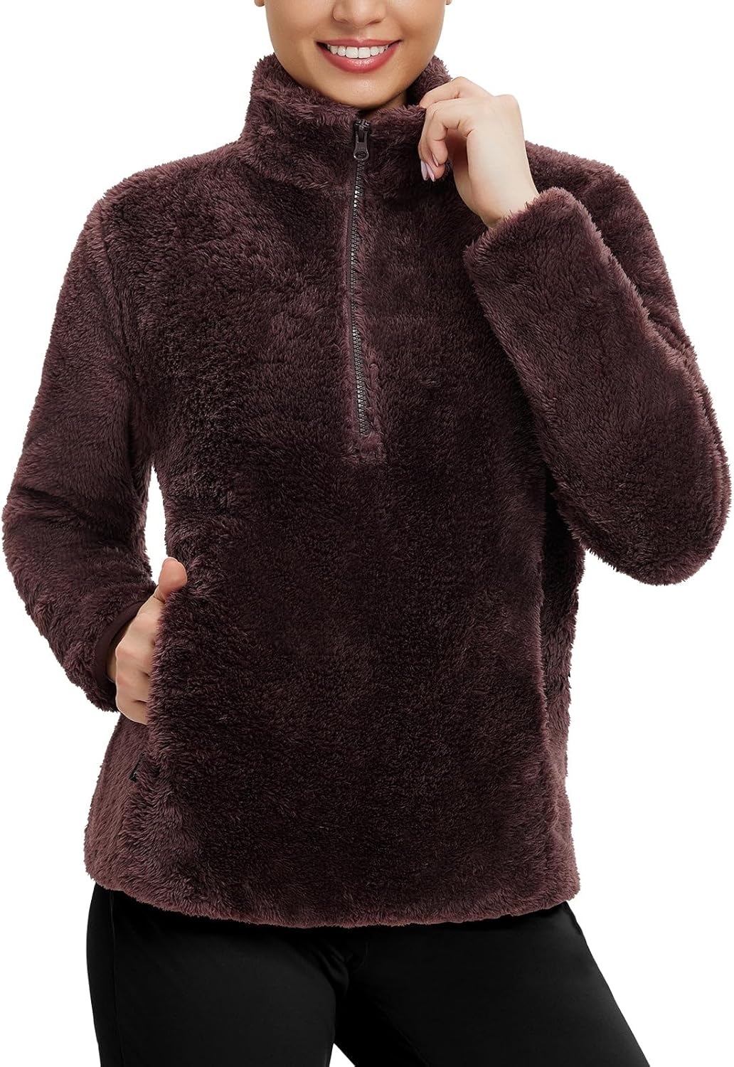 baleaf Women's Quarter Zip Sherpa Fleece Pullover Lightweight Fuzzy Winter Warm Sweatshirt with Zipper Kangaroo Pocket