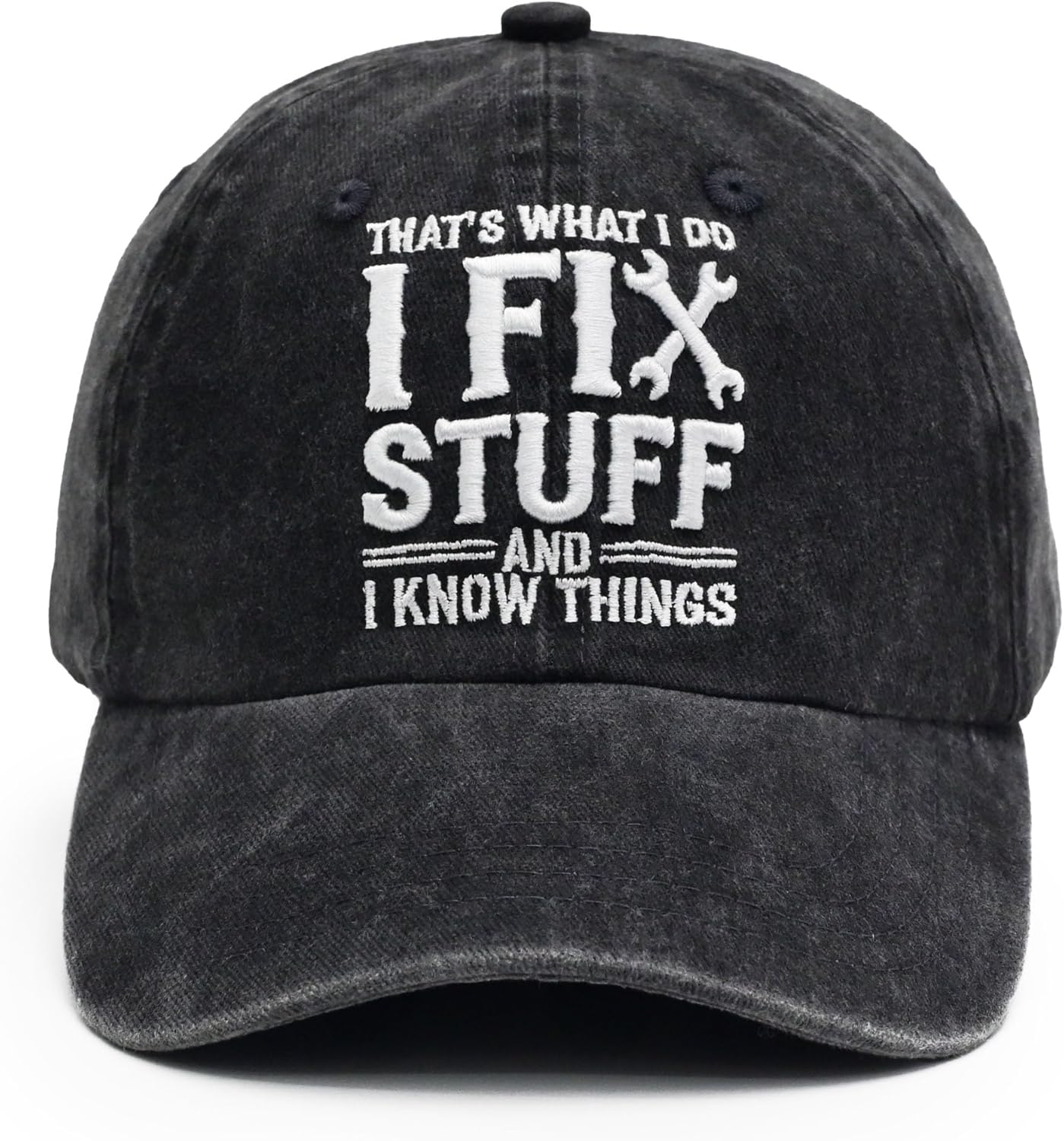 3D Embroidered Cotton Baseball Cap Adjustable Vintage Dad Hat for Men I Fix Stuff I Know Things Washed Hat Birthday Gift