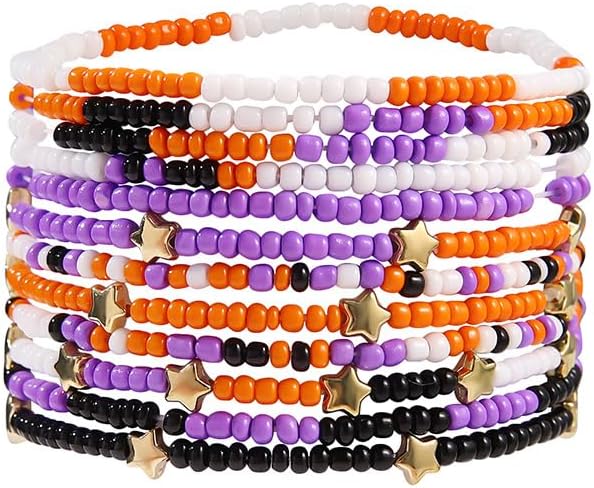 Pingyongchang Cute Halloween Beads Bracelets Set Orange Black Boho Stackable Adjustable Multi Layer Stretch Bangle Bracelet Costumes for Women Men as Halloween Party Vacation Friendship Gifts-12pcs